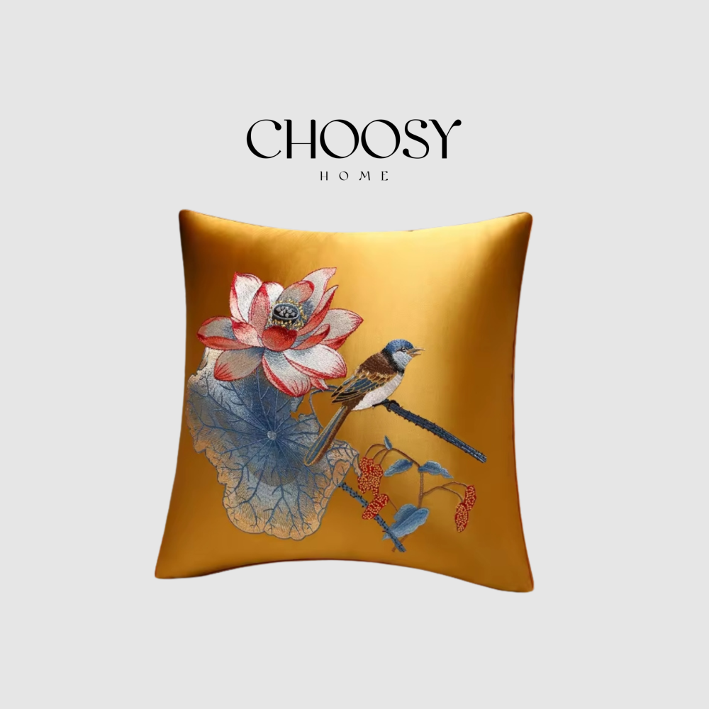 غطاء وسادة مميز من الحرير مطرز بنقشة الزهور و العصافير .