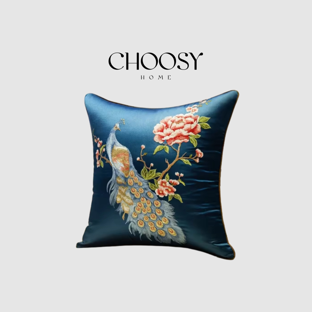 غطاء وسادة مميز من الحرير مطرز بنقشة الزهور والطاؤوس .